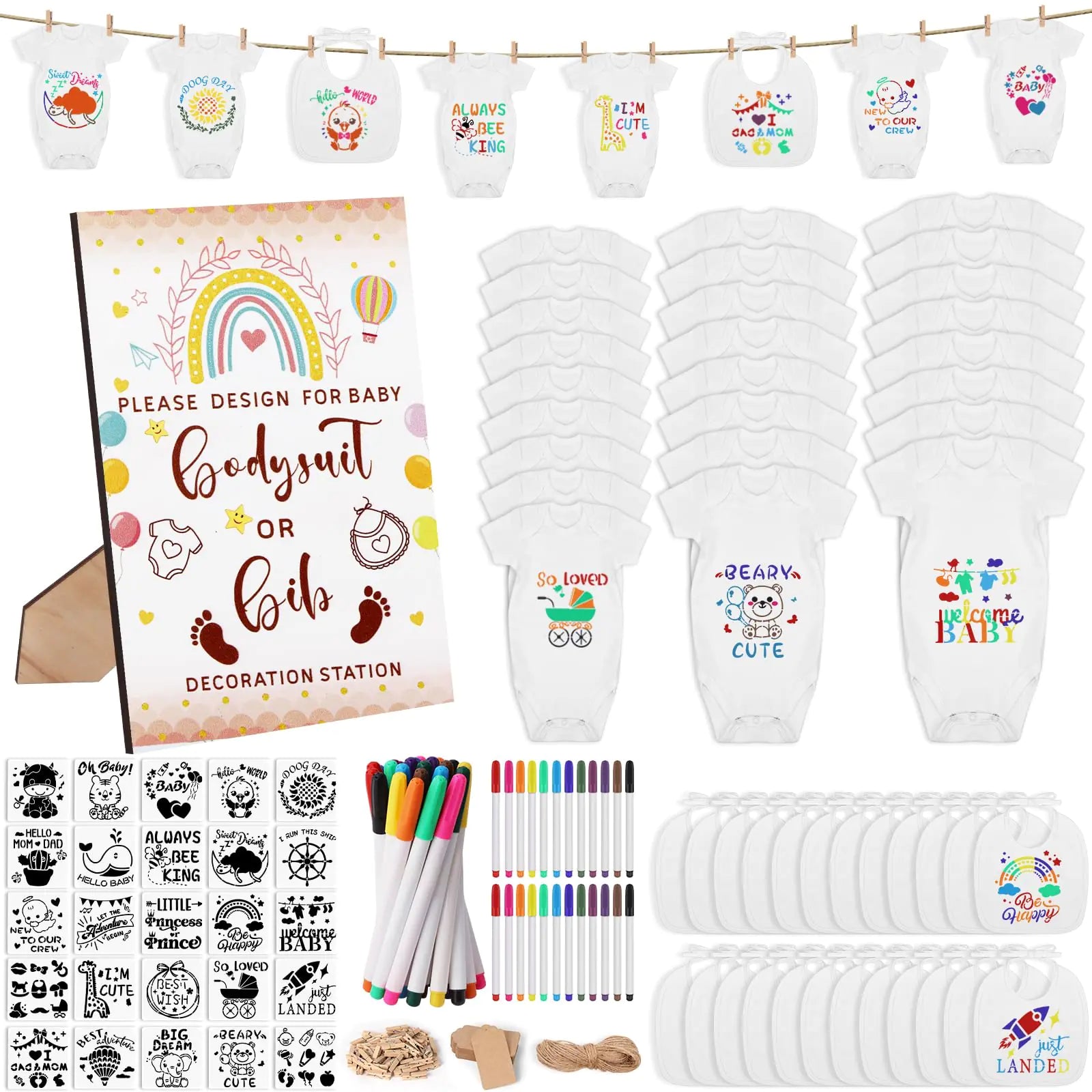 Pydeeirom 201 Pcs Baby Shower Set | Baby Shower Game Sign | Baby Bib & Bodysuit | White Baby Bib | Newborn Bodysuit | Baby Shower | White Onesie Decorating Kit (Rainbow) - # BAAA21110033